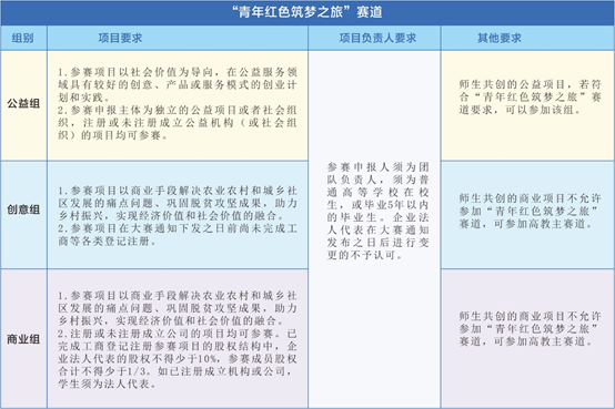 参加“青年红色筑梦之旅”赛道的项目应符合大赛参赛项目要求,同时在推进革命老区、贫困地区、城乡社区经济社会发展等方面有创新性、实效性和可持续性。