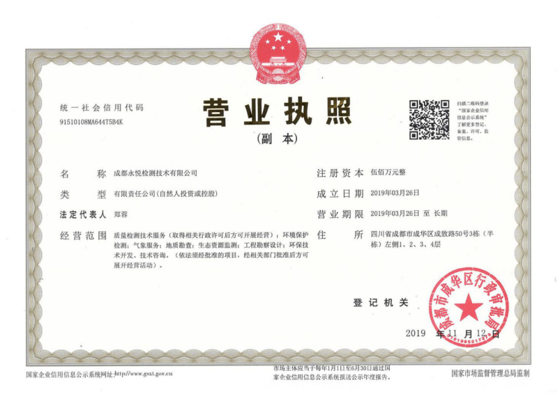 ●成都永悦检测技术有限公司(Chengdu yongyue testing technology co. LTD),位于成都市成华区成致路50号3栋,成立于2019年3月,经成都市成华区市场和质量监督管理局依法注册成立,主要从事环境监测、工程质量等检验检测技术服务工作。