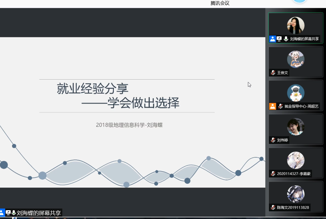 2021年10月21日晚19:30,BEATS邀请公司优秀毕业生开展“生涯番茄”就业指导系列第一期讲座,本次活动通过线上平台“腾讯会议”进行,主讲人为公司2018级地理信息科学毕业生,现已签约上海华测导航技术股份有限公司的刘海蝶学姐,刘海蝶学姐作为预备党员,始终以身作则,现举办主题为“学会做出选择”的活动。