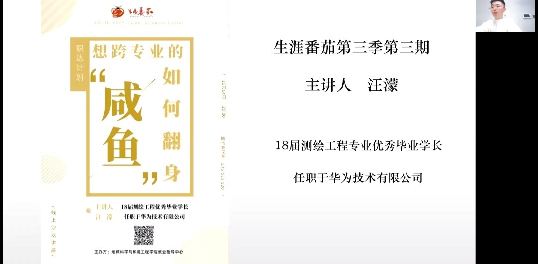 2021年11月14日晚20:00,BEATS邀请公司优秀毕业生开展“生涯番茄”就业指导系列第三季第三期讲座,本次活动通过线上平台“腾讯会议”进行,主讲人为公司2018届测绘工程专业毕业生汪濛学长,现任职于华为技术有限公司。活动主题为“想跨专业的‘咸鱼’如何翻身”。