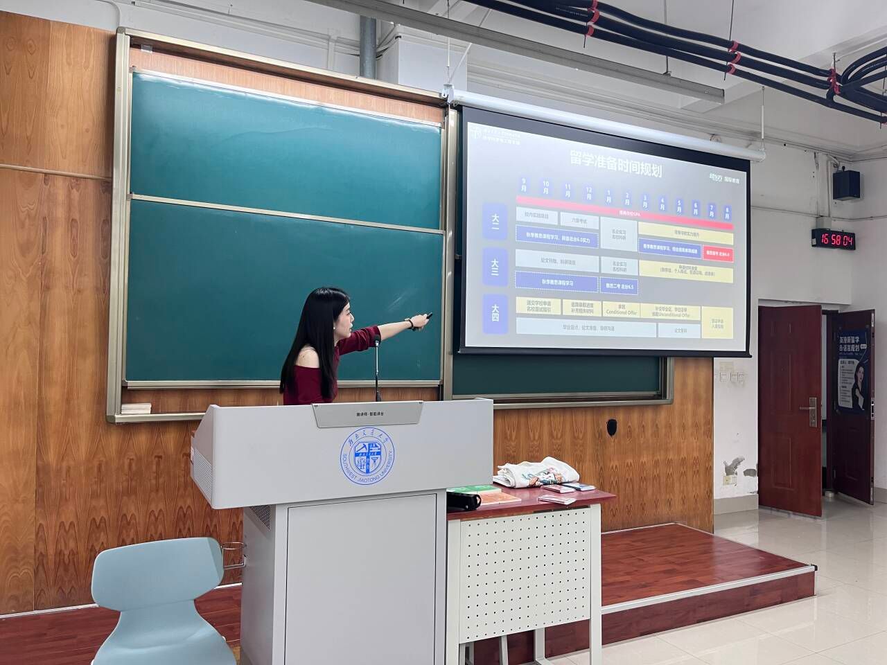5月16日晚4时,开展“考研留学双保险”讲座,讲座由成都新东方国际教育雅思讲师徐佳老师为大家分享考研与留学相关经验,并为大家讲解了考研与留学两种升学方式的学习要求和特点,为有继续升学计划的同学提供了不同的选择思路。