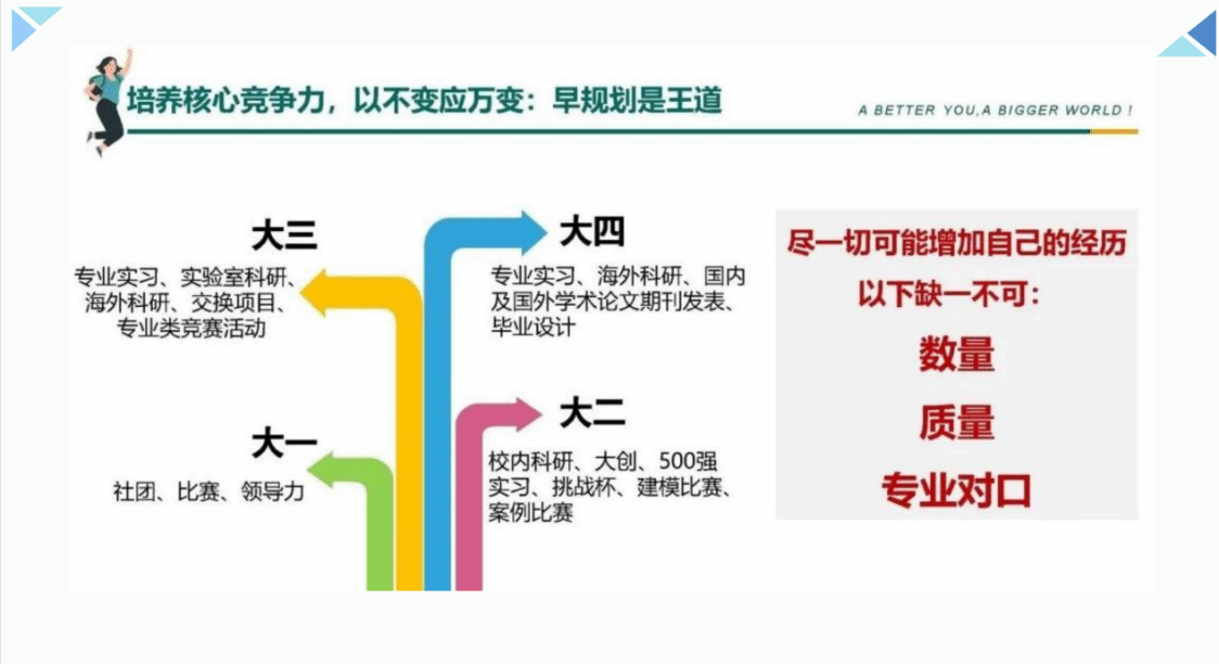 紧接着,李娜老师结合大家当前的具体形势,对于大家如何合理安排大学四年时间给出了很有意义的建议。以大学综合评价体系作为抓手,综合考虑成绩,科研,竞赛等因素在留学、考保研以及就业这些毕业后不同的选择中所发挥的作用,给出因地制宜的建议,同时也对留学这一方向进行具体讲解,以表格形式清晰阐述从初入大学到大学毕业不同时间段内所需要做的事情。