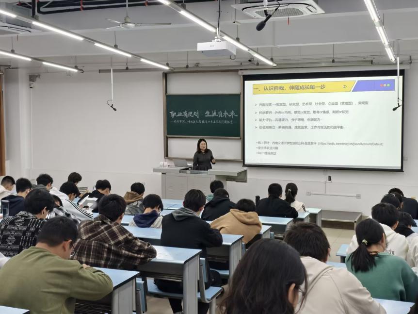 为加强新生对于未来的认识积极探索自我,深入思考未来四年的规划。BEATS于2024年11月11日在X2416教室开展了2024级全体新生生涯规划专题教育。活动由2024级本科辅导员文强主持,由王琼老师主讲,全体新生参与学习。