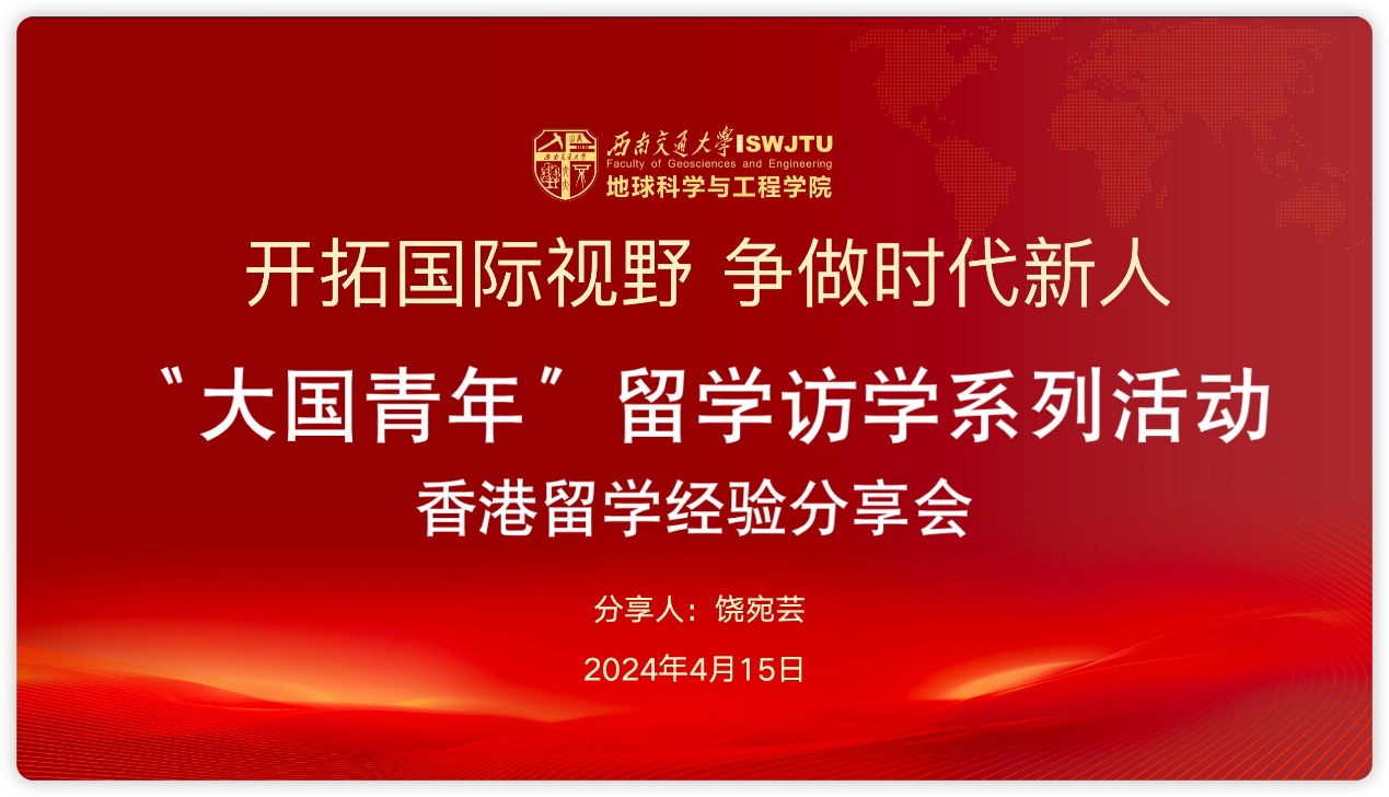 2025年4月15号8点,“大国青年”留学访学系列活动香港留学经验分享会以线上会议的形式展开。本次活动的主讲人为饶宛芸,是SWJTU-OSU安全工程专业2019级员工,2023年就读于香港科技大学环境工程硕士专业,曾在重庆日报/武侯区国有资本投资集团项目管理部实习,获得过绿色建筑从业人员证书 - BEAM Professional Certificate,担任联合国社会影响投资基金会UN-SGDs青年影响大使,现为香港数码港某海水淡化公司项目经理。