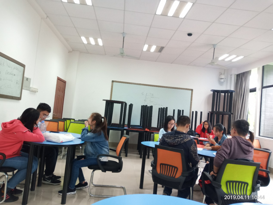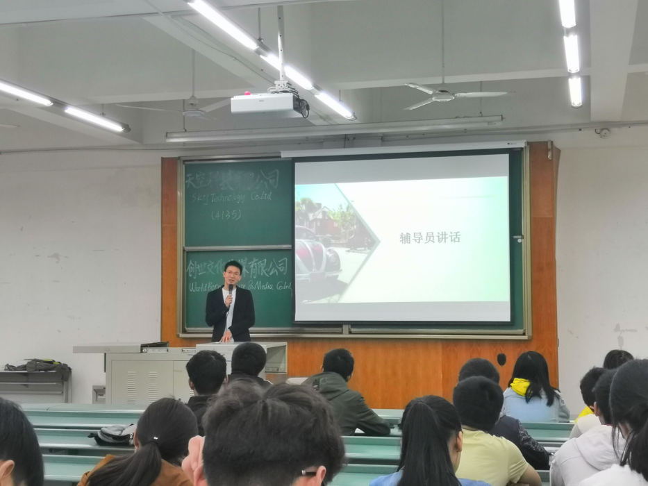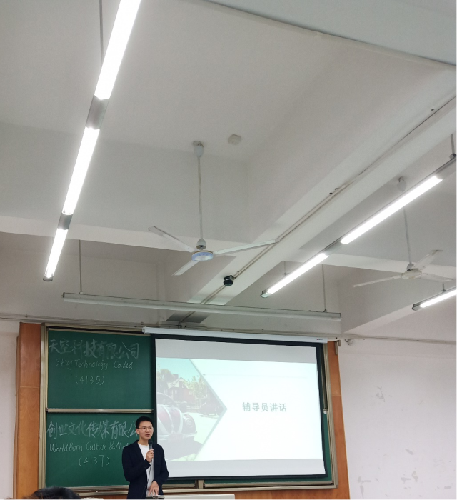 4月11日上午9:35,大家均上完第一讲课,带着自己提前准备好的简历来到4350,原本宽阔地教室因为同学们地到来竟呈现出拥挤之象。将近10:00,同学们大约都已来齐。我测绘辅导员杨都强老师也已到场,测绘一班团支部书记林其炜将制作好的powerpoint展示在多媒体屏幕上,一侧的黑板上写着“天空科技有限公司 4135”,下方写着“创世文化传媒有限公司 4137”,分别告知同学们自己面试的地点。另一边,测绘二班、三班、四班团支部书记,何欢、张昊雪、刘海蝶均对各本班参与本次活动的同学做具体介绍和面试规则。
