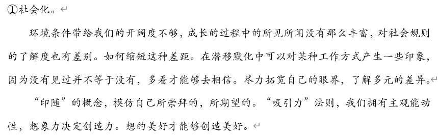 第二部分的关键词为社会化。所谓的社会化,是指一个人对于社会规则的了解度,是每个同学就业工作之后必须适应的环节。尽管每个人的家庭条件不同,社会化的认知程度也有不同,但认知社会化的途径很多,比如说来访教师办公室、走访企业、出国留学等形式,都是丰富自己对社会认知的途径。人一辈子都在模仿自己看到或者所想象的事物,因此社会化的过程就是我们学习、接受新事物的一种途径。