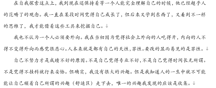 第三部分的关键词为自我探索。自我探索指的是你对于自身兴趣、性格、能力、价值观的了解过程。兴趣是一个人经常提及的名词,但要做到真正了解你的兴趣并不容易,同时,兴趣不是你拒绝一项事物的借口。性格决定着一个人的社会分工,每一种性格都有自身的闪光点,因此不要因你的某种性格而自卑。能力分为技术、人际、概念技能三个方面。价值观指的是一个人依据一种特定的标准去放弃一些事情。自我探索的过程是长期的,需要我们在成长经历中慢慢发掘。
