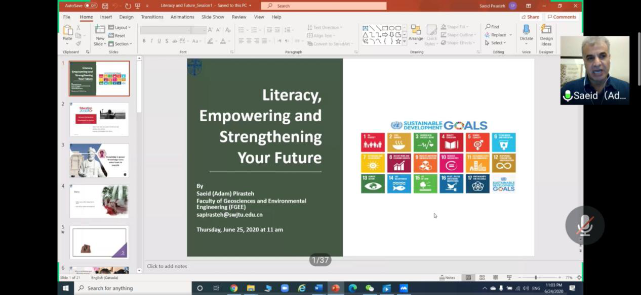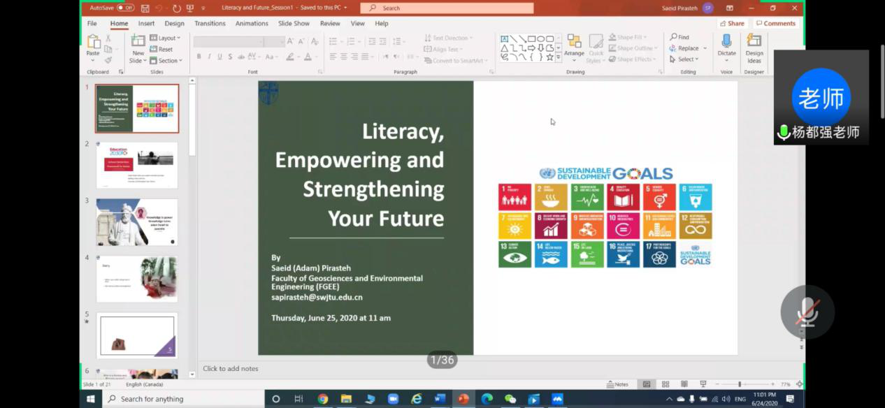 为响应教育部“停课不停学、停课不停教”的号召,助力地学国际化示范公司申建工作,营造国际学习氛围,进一步提升公司深造工作实效,公司就业指导工作中心邀请到Saeid(Adam)Pirasteh(博士,副教授)于6月25日上午11:00通过开展“国际化+名师讲堂”国际视野与出国留学系列讲座第五期,会议由杨都强老师主持。