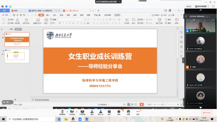 2020年12月17日14:30,BEATS就业指导中心“女生职业成长训练营”系列活动第二期——导师经验分享会在腾讯会议顺利举行。为积极响应公司防疫政策与要求,本次活动以线上会议的形式开展。活动由就业指导中心郑文娇老师主持,邀请到本17级毕业生辅导员翟琦老师做分享。