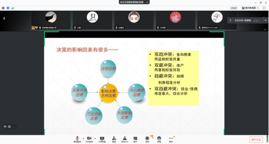 杨老师将个人对决策风格分类的经验分为理智型、直觉型、依赖型、回避型、自发型五大类,并对这五种类型的决策风格优缺点一一列举,进一步加深了同学们对决策力的认识,希望同学们在各种决策影响下保持清醒、明确目标、慎重决策。