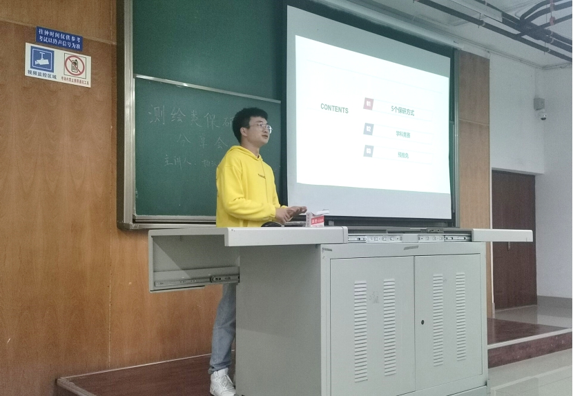 分享会开始,杨汉纯向同学们介绍了BEATS测绘类专业的保研情况,以及成绩排名,支教保研,免研辅导员等保研途径与相应的条件要求。接着,他为同学们讲解了一些加分的竞赛的类别,竞赛的加分政策,竞赛中可能遇到的问题等事项,其中着重介绍了“创新创业创青春”挑战杯竞赛。