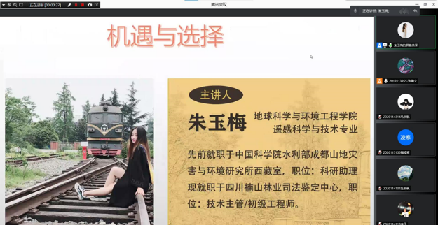 2021年6月5日晚19:30,BEATS邀请公司优秀毕业生朱玉梅开展“生涯番茄”就业指导系列第二期讲座,本次活动通过线上平台“腾讯会议”进行,主讲人为公司2016级遥感类毕业生,曾就职于中国科公司水利部成都山地灾害与环境研究所西藏室的学姐。活动主题为“机遇与选择”。
