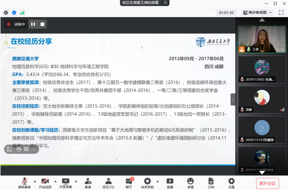 2021年6月10日晚19:30,BEATS邀请公司优秀毕业生开展“生涯番茄”就业指导系列第三期沙龙,本次活动通过线上平台“腾讯会议”进行,主讲人为公司2013级地理信息科学专业毕业生,现就职于中移系统集成有限公司的王倩学姐。活动主题为“遇见未来的自己”。