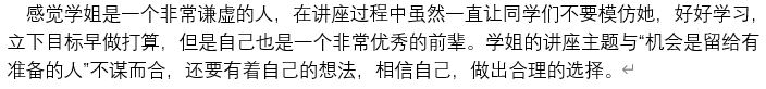 最后,王倩学姐回归主题,对于未来的自己能够提早考虑,做好打算和规划,认真选择,因为现在做出的每一个选择,都由将来的自己负责,同时也要相信自己,坚定信念。