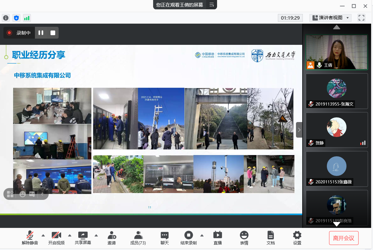 在之后的职场经历中,学姐讲到自己曾在广州、新加坡等地,现在在成都做着与大学专业相关的工作,着重描述了自己作为公司项目经理的工作内容和改换职场后的感受与体会。