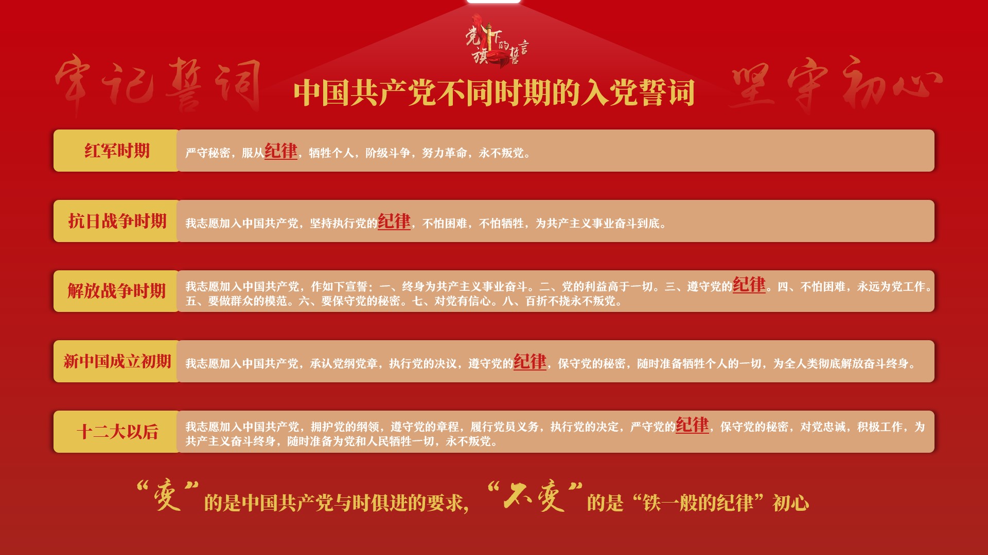 活动共分为“一场宣誓一次砥砺”、“一张贺卡一份寄语”、“一本读物一次督促”、“一次分享一份传承”,“一堂党课一次洗礼”、“一首红歌一份决心”六个部分。