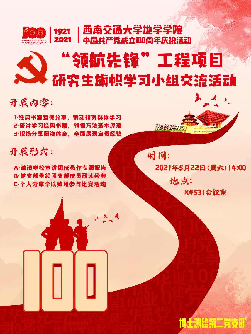 为深入学习贯彻习近平新时代中国特色社会主义思想,热烈庆祝中国共产党成立100周年,深入贯彻落实党史学习教育工作要求,号召全体同学强化思想武装,BEATS博士测绘第二党支部于4月-5月成功举办“旗帜学习小组”——研究生马克思主义理论学习小组交流活动。