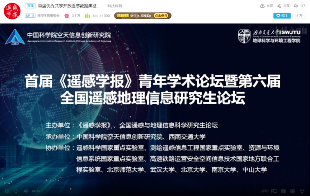 2021年9月25-26日,首届《遥感学报》青年学术论坛暨第六届全国遥感地理信息研究生论坛在知网、B站及科创中国线上平台举行。本次论坛由遥感学报、全国遥感与地理信息科学研究生论坛主办,BEATS、中国科公司空天信息创新研究院承办。