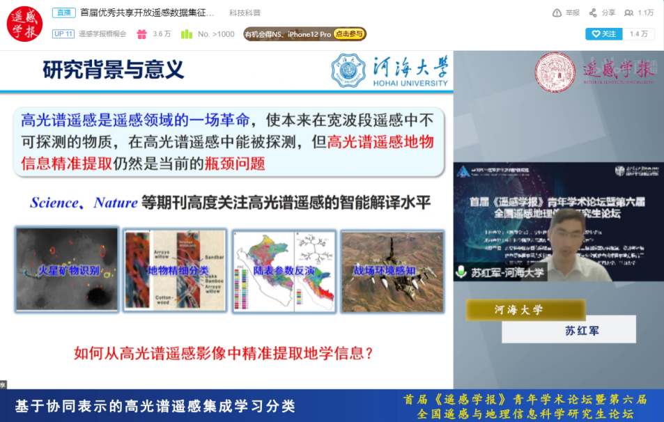接着,来自河海大学的苏红军教授作为特邀嘉宾进行了“基于协同表示的高光谱遥感集成学习分类”的成果汇报。他简述了高光谱遥感的发展,并从样本层面、特征层面、分类器层面展开分析了集成学习的方法。