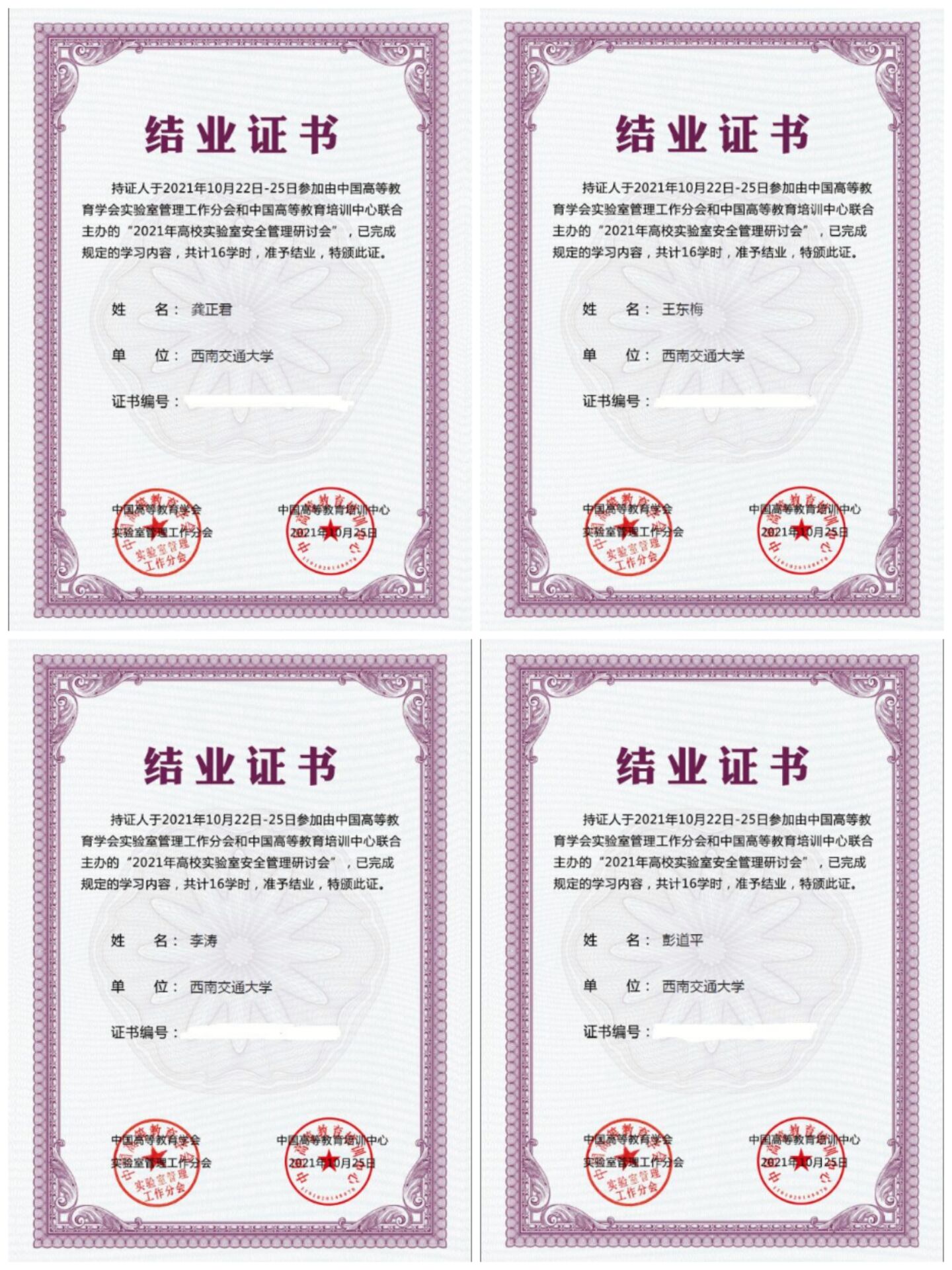 为落实教育部关于切实维护高校安全稳定的统一部署,做好公司关于二级公司实验室的安全保障工作,深入推进实验室安全管理工作规范化、专业化、信息化,提升高校实验室安全管理能力和水平,公司党政领导高度重视,予以经费支持,在公司分管实验室安全工作领导龚正君副经理的带领下,公司安全秘书、实验室主任、实验室教师,在严格遵守公司及参会当地疫情防控各项要求前提下与资实处相关领导及其他兄弟院系相关教师积极参会,共同认真学习并完成相关任务,取得中国高等教育培训中心结业证书。