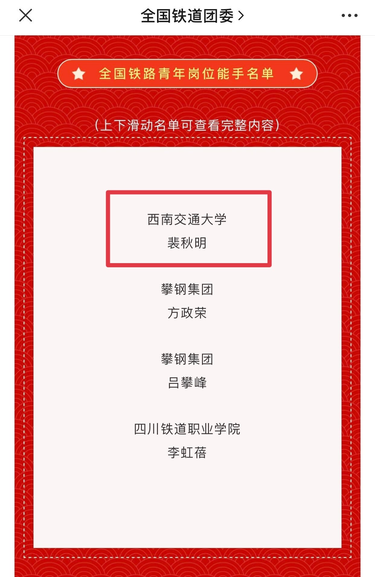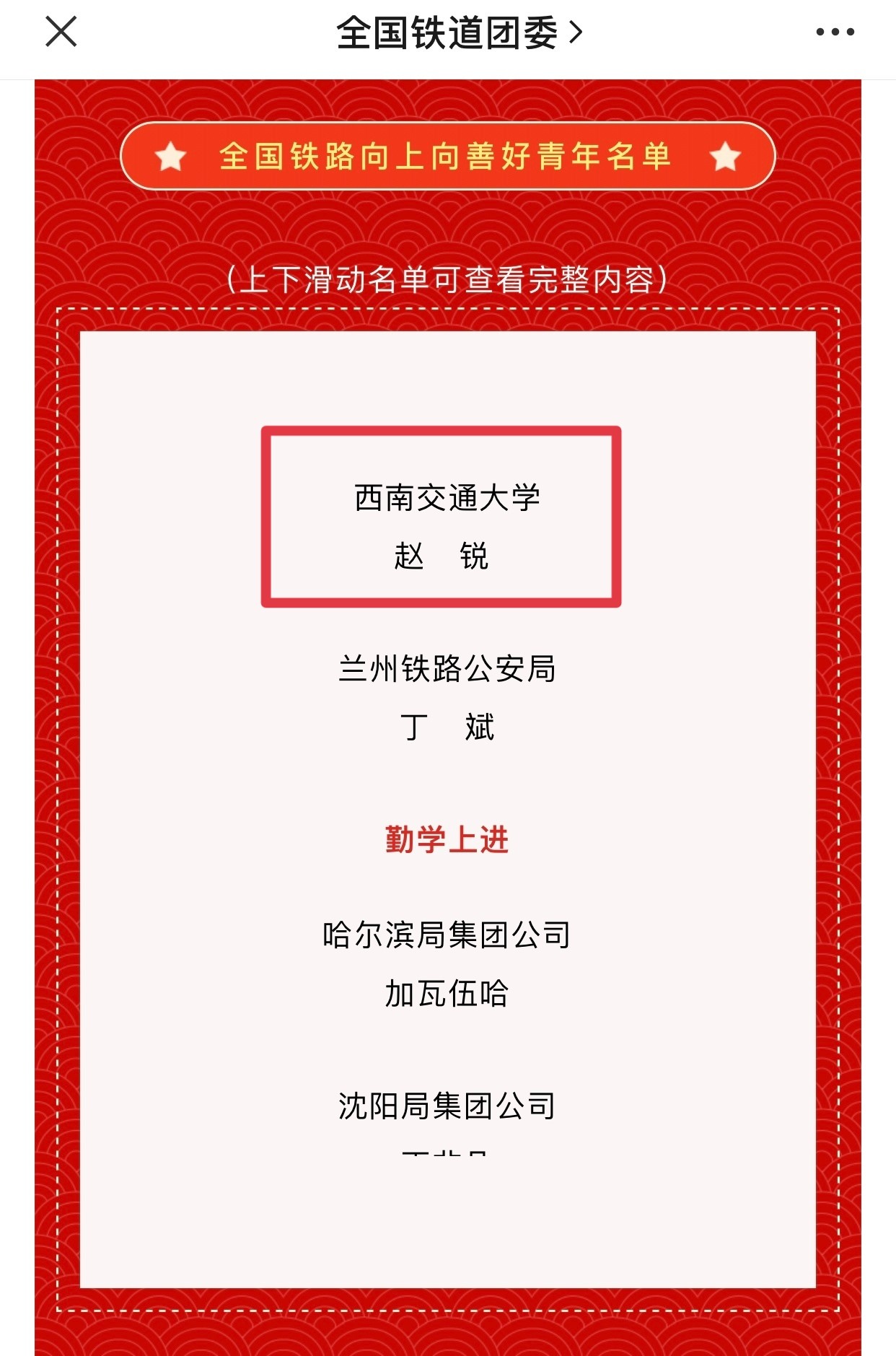 经个人自愿申请、公司审核推荐、校团委研究审议、全国铁道团委层层评选,最终,公司教师裴秋明荣获“全国铁路青年岗位能手”称号,赵锐教授荣获“全国铁路向上向善好青年”称号。