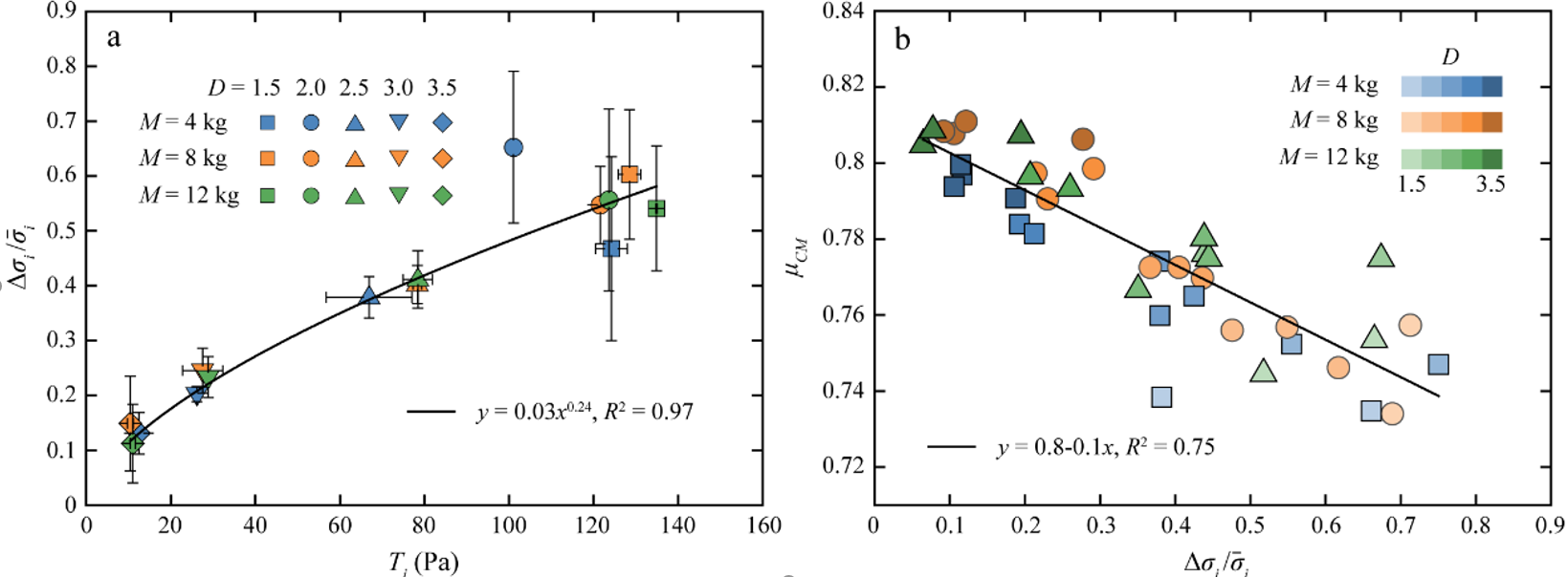 (4)颗粒流内部颗粒的扰动程度可通过波动应力与平均应力的标准偏差进行量化,颗粒流的颗粒扰动程度与颗粒惯性力呈正相关关系,与颗粒流的等效摩擦系数呈负相关关系(图3),表明与高频高峰值波动应力相关的颗粒扰动可以促进颗粒流的流动性。实验的研究结论为声波流态化、机械流态化、基底压力波导致的流态化,以及本团队2015年提出的“自激振动悬浮减阻”等动力学效应提供了重要的实验佐证。