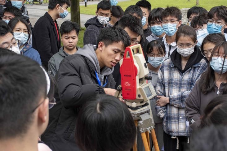 4月16日,大赛的仪器培训活动在X4157和四教天井火热开展,由省赛获奖选手向参赛同学们教授内业计算方法和相关测量仪器的使用方法。