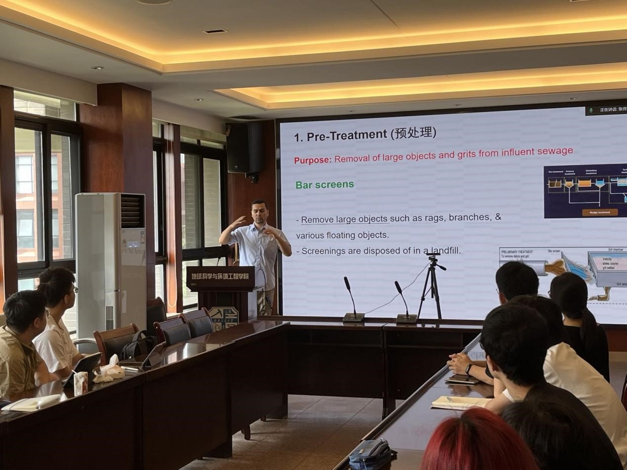 Hassan副教授作题为“Wastewater & sludge treatment in treatment plants”的讲座。课程一开始,Hassan副教授就什么是污水、污水从哪里来、雨水是不是污水、列举污水污染物、污水处理厂处理后水和污泥去了哪里这五个问题,与同学们进行讨论交流,课堂气氛活跃。