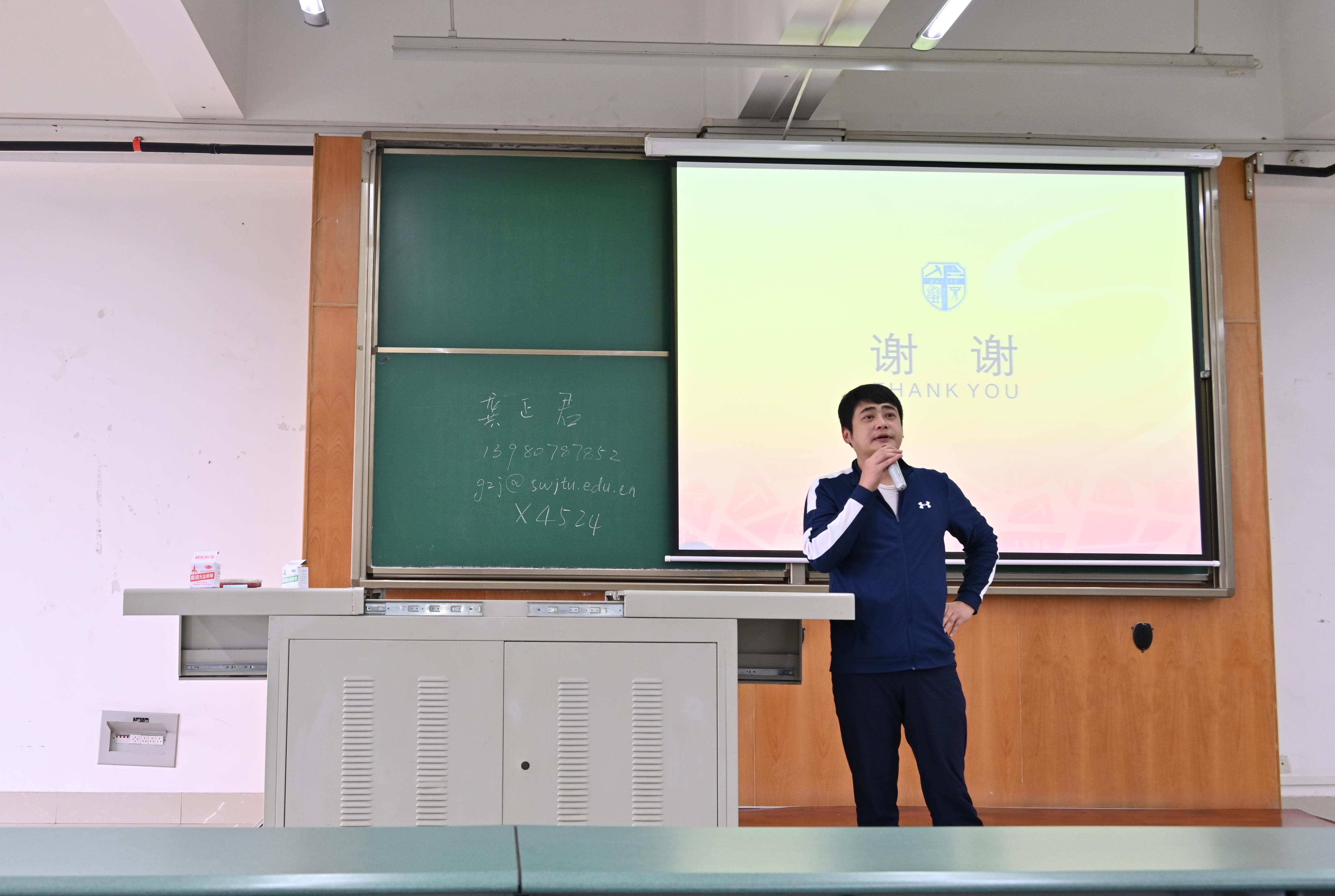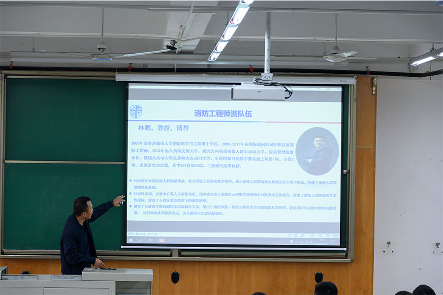 第二个环节由消防工程系老师主要讲述,李涛老师主持。李涛从全球火灾、消防事故等方面引入消防专业介绍,为同学们讲解了学科专业开设历史、全国开设消防工程专业高校、公司消防工程系发展,以及专业管理服务团队。他对公司人才培养体系、专业培养目标、专业领域进行详细说明,向同学们展示了公司消防实验中心的建设,详细说明了消防专业的国际化交流以及消防工程的就业前景。他强调,火灾安全是国家公共安全的重要组成部分,随着社会时代的发展,消防专业的优势也愈发显著,鼓励同学们积极选择消防专业。