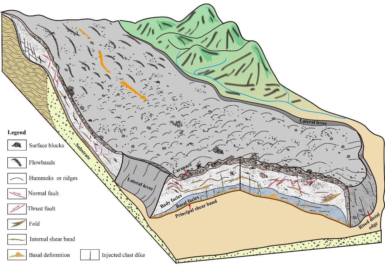 最近5年来,在第二次青藏高原综合科学考察研究任务九“地质环境与灾害”专题五项目的支持下,BEATS程谦恭教授科研团队对帕米尔高原的高速远程滑坡进行了持续的调查研究。近期,团队成员史安文博士研究生、王玉峰特聘研究员等通过野外深入细致地调查研究,揭示了帕米尔高原东缘依买克(Iymek)滑坡(图1)的地质特征。通过遥感影像、地质调查、统计分析等研究手段,分析了依买克滑坡的孕灾地质背景和源区基岩物质组成,确定了依买克滑坡的同震启动机制;通过对源区及堆积区初始地形的重建,确定了依买克滑坡是中国大陆目前已知最大规模的高速远程滑坡;详细刻画了滑坡堆积体存在的各种堆积地貌与内部堆积结构,概化了依买克滑坡堆积模型(图2);在此基础上,对各种地貌单元与内部结构的形成机制进行深入分析,揭示了依买克滑坡路径相依的运动演化过程、滑坡-下伏层相互作用特征以及滑坡停积的动力学机制;并与全球不同地区高速远程滑坡实例进行对比分析,揭示了下伏层特性对高速远程滑坡堆积地貌与堆积结构的重要控制作用。主要的发现和认识如下: