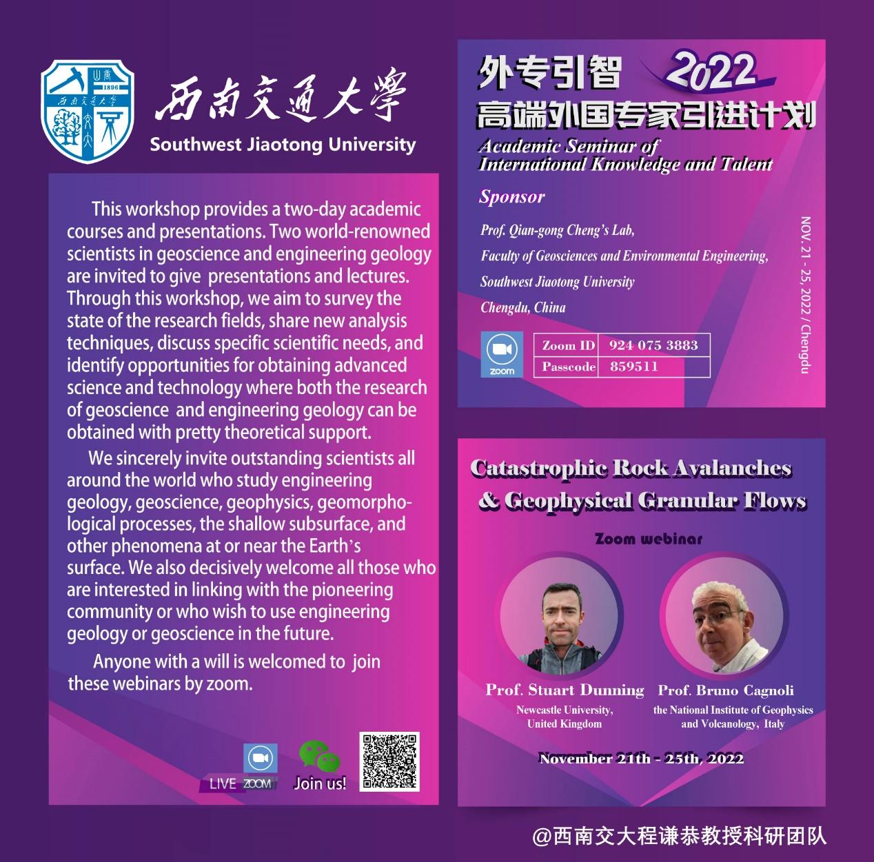 2022年11月21日至25日,由BEATSBEATS程谦恭教授主持的2022年度“外专引智-高端外国专家引进计划”学术活动顺利举办。来自国际知名高校及科研机构的杰出科学家Stuart Dunning和Bruno Cagnoli分别围绕高速远程滑坡沉积学特征与颗粒流动力学特性研究,呈现了精彩的学术报告。本次活动以网络视频会议方式开展。参会人员认真听取学习了2位专家的学术报告,并在会后积极与专家交流,受益匪浅。
