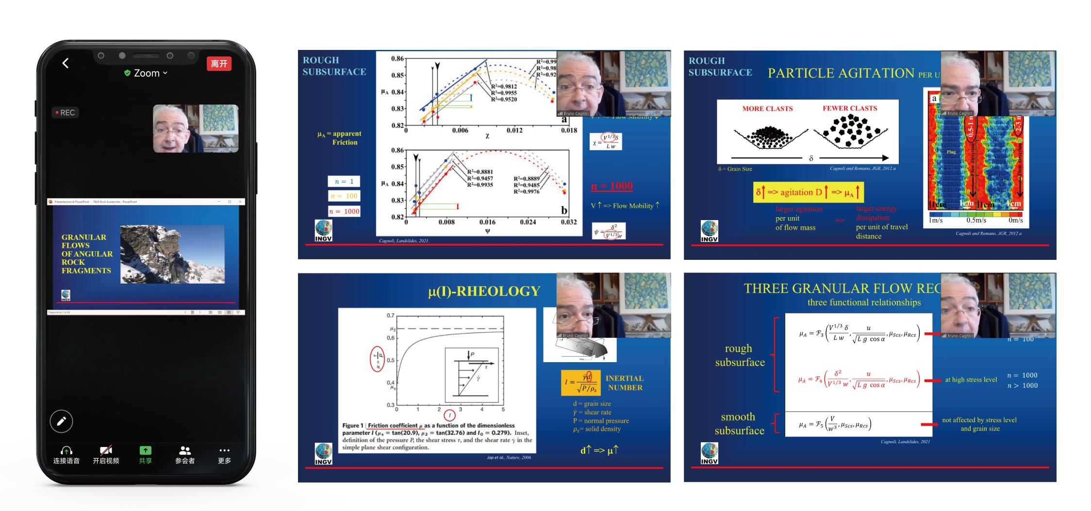 Cagnoli教授首先介绍了高速远程滑坡这一特殊的大规模、高致灾性的地球物理颗粒流的非稳定、竖向稀疏化、侧向受限等特性,并结合滑坡研究先驱Albert Heim于1932年提出的滑坡体积效应(volume effect),引出了高速远程滑坡流动性这一国际滑坡动力学领域悬而未决的科学问题。