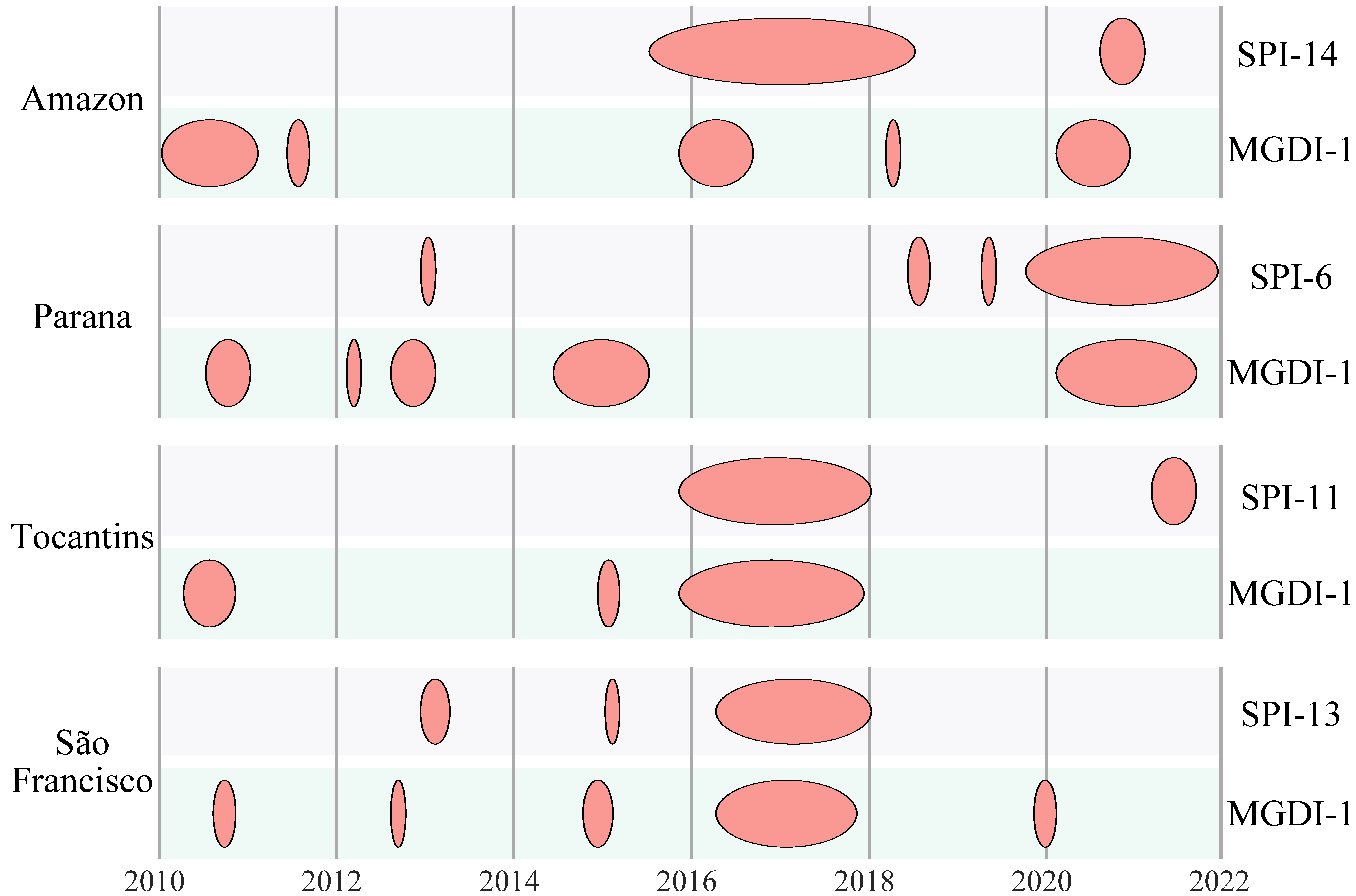 这项最新研究成果中,作者以多尺度拓展为导向,发展了一种基于GNSS的多尺度水文干旱指数Multiscale GNSS-based Drought Index (MGDI)。这种新的干旱监测指标基于全新的干旱调查框架,即“全水文要素”+“多时间尺度”,能够应对更加复杂的极端事件。该研究从多个时间尺度描述2010–2021年巴西的水文干旱特征出发,聚焦于MGDI多尺度应用,利用月尺度至年尺度 MGDI调查干旱的时空演变和干旱传播,并在月尺度到年际尺度上探索了水文干旱与厄尔尼洛(ENSO)的关系。研究结果显示,在1.5–3年的时间尺度上水文干旱与 ENSO 之间存在强相关,相关系数达0.6以上。结果表明,MGDI 能够克服GNSS-DSI单一尺度的缺陷,量化效果优于依赖几种气象水文分量的干旱指数,可以更稳健地表征水文干旱。这项工作进一步拓展了GNSS在水文学中的应用,同时促进了新兴跨学科水文大地测量的发展。