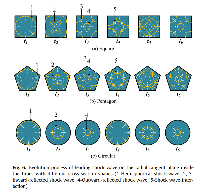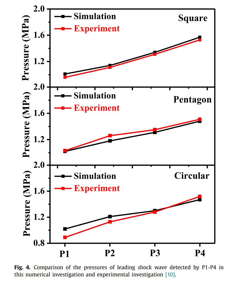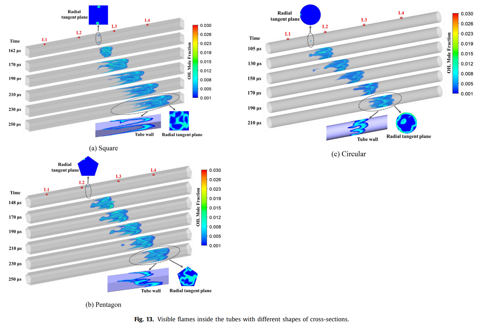 研究利用自主开发的高压氢泄漏自燃数值模型,对方形、五边形和圆形截面(管壁角分别为90°、108°和180°)管道中高压氢气泄漏自燃微观动力学机理开展研究,提出了不同截面管道内激波结构产生、发展、反射、叠加、突变等演变规律,分析了管道边界层与氢射流的相互作用,研究了氢/空气混合物在不同截面管道内的形成机理,揭示了不同截面管道内高压氢泄漏自燃的微观动力学机理。同时,此数值模拟结果与实验结果进行对比,管道内激波压力、自燃发生位置与时间与实验结果吻合度较高,再一次验证了本团队自主开发的高压氢泄漏自燃数值模型的可靠性,扩展了高压氢泄漏自燃数值模型的应用范围。