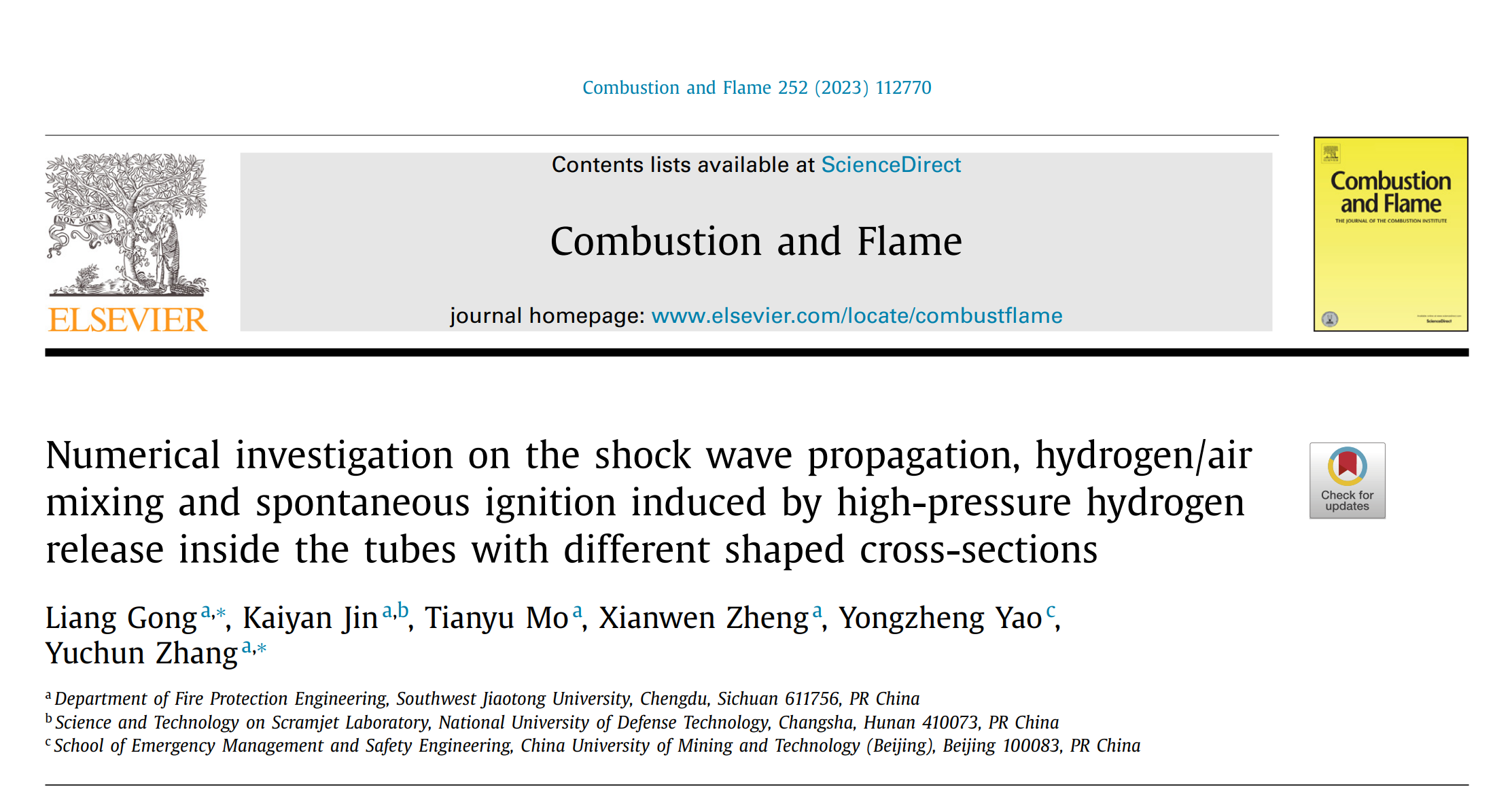 近日,公司消防工程系张玉春教授团队弓亮副教授在国际顶级期刊Combustion and Flame(火灾科学及燃烧学领域国际顶级期刊,中科院分区一区,最新影响因子5.767)上发表了题为“Numerical investigation on the shock wave propagation, hydrogen/air mixing and spontaneous ignition induced by high-pressure hydrogen release inside the tubes with different shaped cross-sections”的高水平学术论文。弓亮副教授为第一作者,张玉春教授为通讯作者。这是我系教师以BEATS为第一单位首次在该期刊发表学术论文。