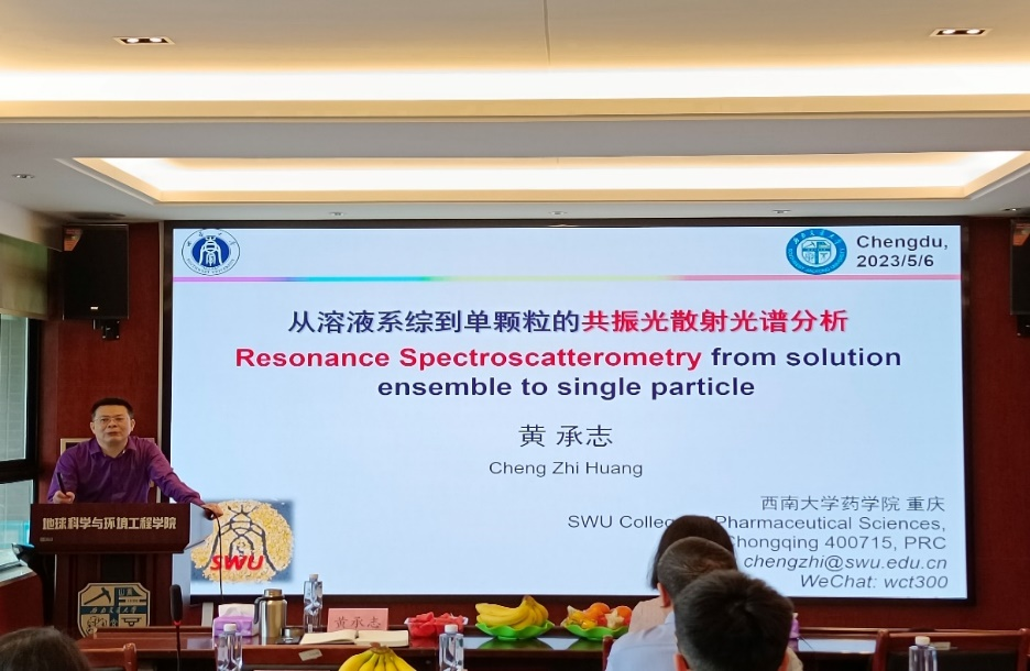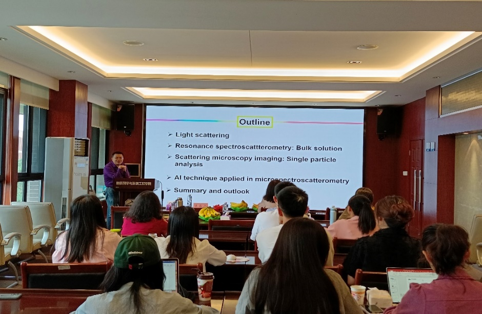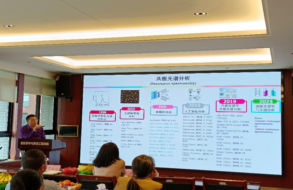 在本次讲座中,黄承志教授以“从溶液系统到单颗粒的共振光散射光谱分析”为汇报主题,围绕如何发现及利用光散射信号的问题,介绍了共振光散射光谱分析方法的发展历程,以自身的研究动机出发,讲解了光散射理论基础、溶液共振光散射光谱分析法、局域等离激元共振光谱分析法、单颗粒共振光散射光谱分析法特点及其应用、人工智能技术结合光谱分析的方法;最后,对光散射光谱分析面临的挑战及机遇进行了讲述。