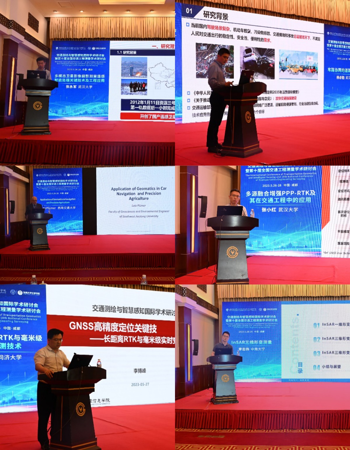 大会特邀报告(上排左起,张永军教授、杨必胜教授团队报告;中排左起,Lutz Plümer教授、张小红教授报告;下排左起,李博峰教授报告、李志伟教授团队报告)