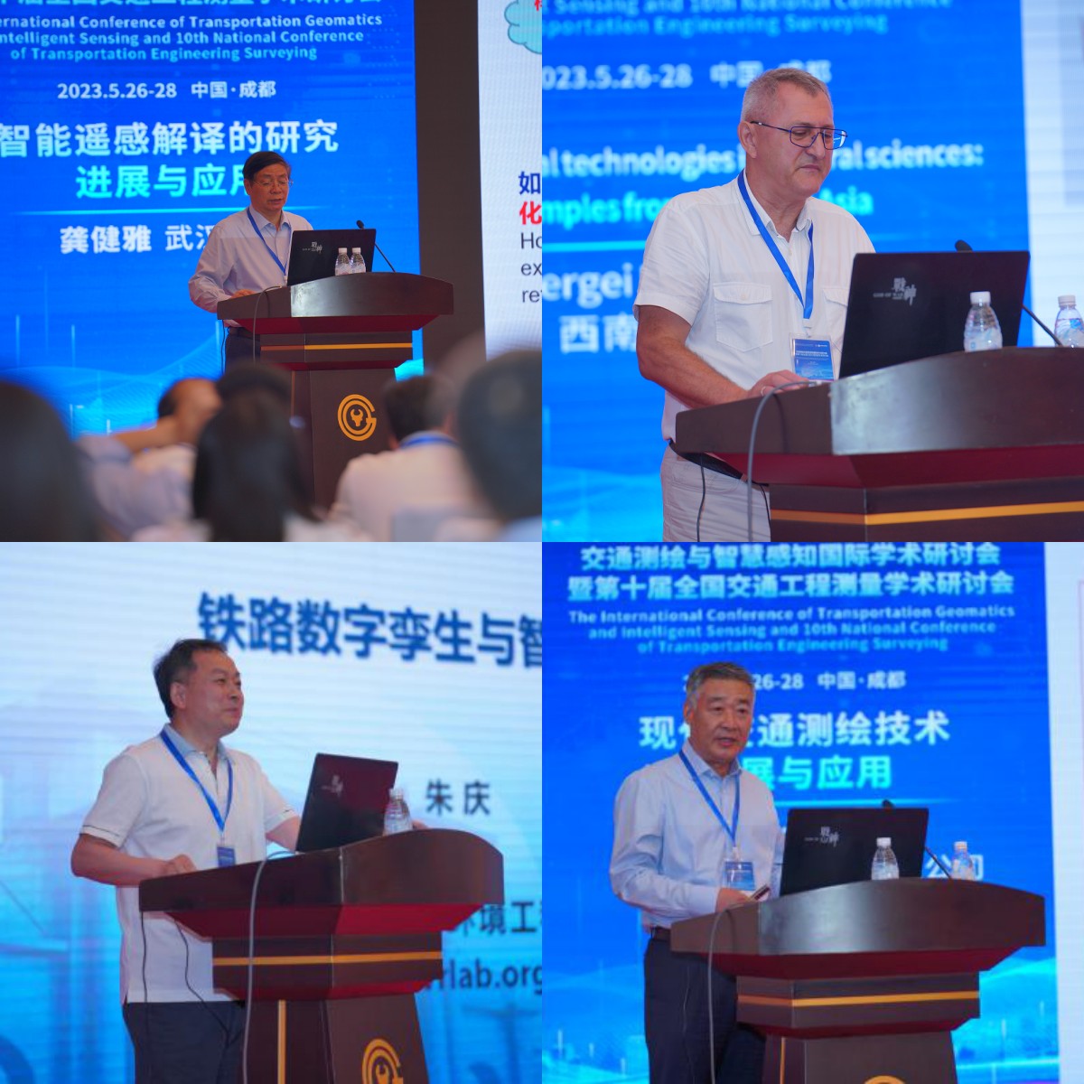 大会主旨报告(上排左起,龚健雅院士、Sergei Krivonogov教授;下排左起,朱庆教授、王长进全国工程勘察设计大师)