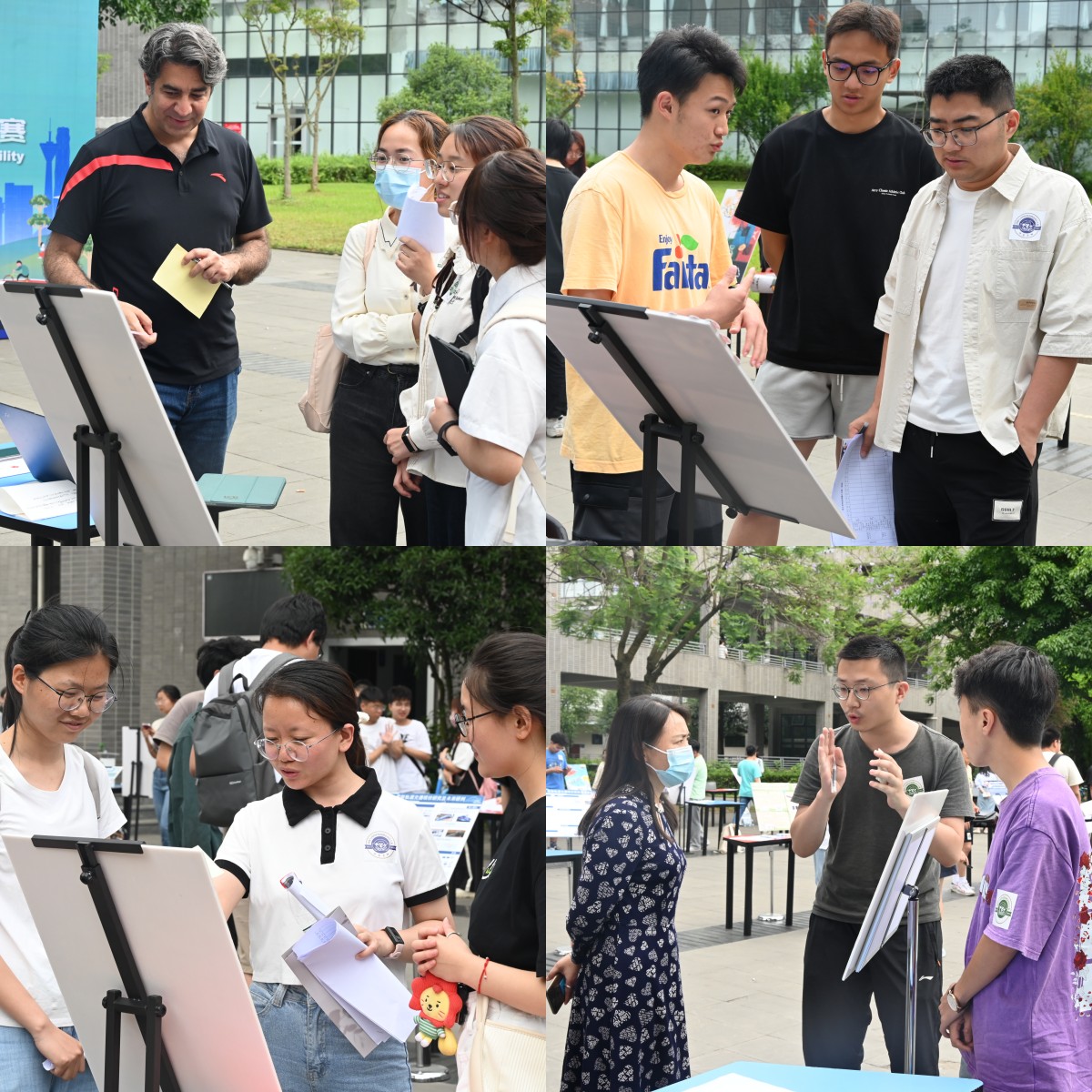 成果展现场气氛热烈,参赛选手们积极主动,向老师和同学们展示并讲解自己的作品。评委老师们也向同学提问,进一步了解作品细节并向参赛同学提出改进建议。其中,理论组部分同学的英文论文吸引公司外籍教授Ehsan的注意,参赛同学在现场用英语为其做详细讲解。手工组作品《基于咖啡渣复合材料的可持续烟灰缸设计》凭借出色的设计理念,完整的设计成果,精美的海报赢来了老师和同学们的驻足围观,并收获了众多好评。
