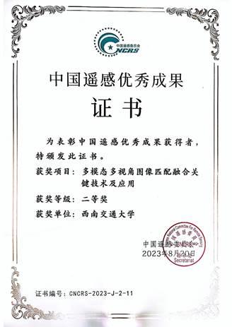 2023年8月20日-2023年8月22日,第二十二届中国遥感大会在常州举行,共有2000多遥感领域学者和产业界人士参加了该次大会,大会上表彰了中国遥感优秀成果,其中,由BEATS地球科学与环境工程叶沅鑫老师课题组主持的“多模态多视角图像匹配关键技术及应用”成果获得了2022年度中国遥感优秀成果二等奖,中国遥感委员会在大会上颁发了获奖荣誉证书。