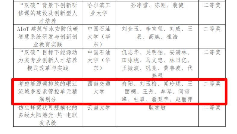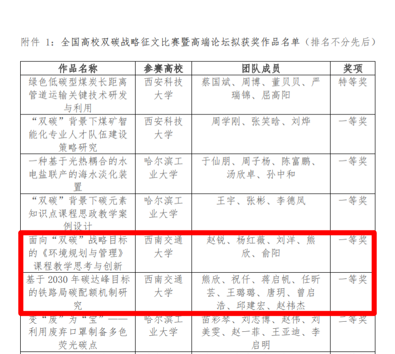 经评审委员会和大赛组委会审议通过后,共评出特等奖1项、一等奖5项、二等奖11项、三等奖20项,优秀奖45项和优秀组织奖14项。BEATS赵锐老师团队作品《面向“双碳”战略目标的〈环境规划与管理〉课程教学思考与创新》和熊欣老师团队作品《基于2023年碳达峰目标的铁路局碳配额机制研究》荣获一等奖,俞阳老师团队作品《考虑能源碳排放的岷江流域多要素管控单元精细划分》荣获二等奖。