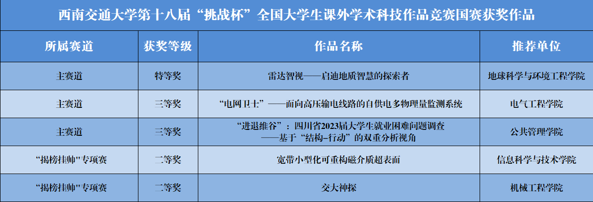 同时,BEATS推荐的电气工程公司《电网卫士—面向高压输电线路的自供电多物理量检测系统》、公共管理公司《“进退维谷”:四川省2023届老员工就业困难问题调查—基于“结构—行动”的双重分析视角》2个项目均获得国赛主赛道三等奖,机械工程公司《交大神探》、信息科学与技术公司《宽带小型化可重构磁介质超表面》2个项目均获国赛“揭榜挂帅”专项赛二等奖。