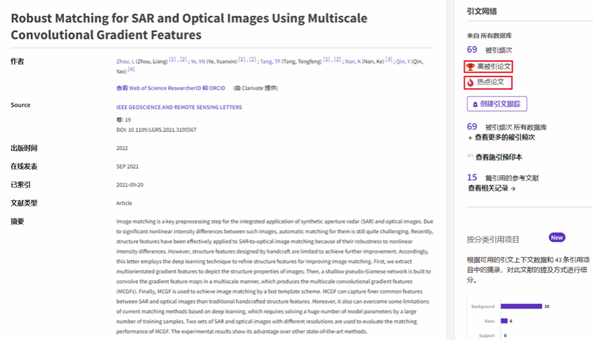 在近2个月内被引次数进入地球科学学科(GEOSCIENCES)全球前1‰,被ESI热点论文(Hot Papers)收录。该论文于2021年9月发表在遥感SCI期刊“IEEE Geoscience and Remote Sensing Letters”上。