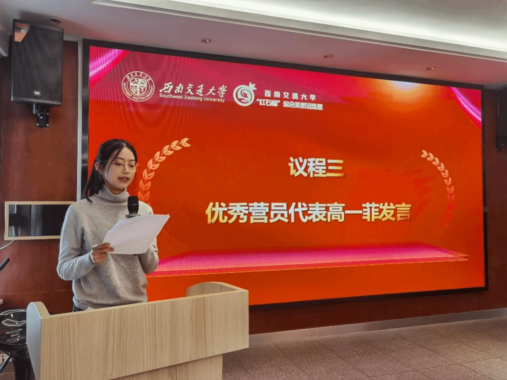 接下来,本届训练营优秀营员代表高一菲同学进行了发言,她回望了自己的学习经历,从自己的感受出发,呼吁全体同学要学会团结,要像石榴籽一样紧紧抱在一起,只有团结一心才能实现进步卓越、才能实现中华民族的伟大复兴。