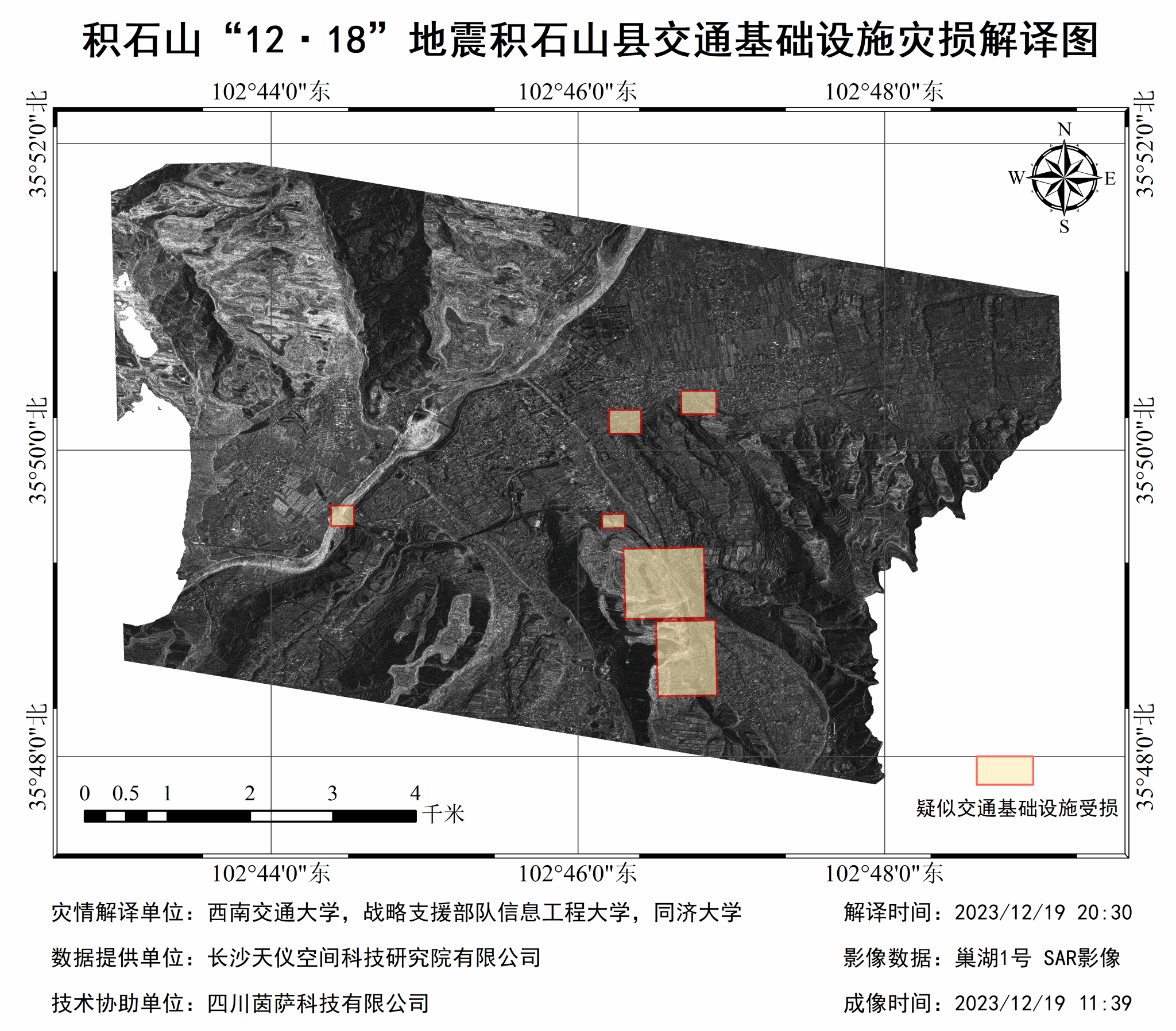 为及时掌握本次积石山县震中区域造成的交通基础设施损毁情况,BEATS微波遥感科研团队的刘国祥、张瑞等联合战略支援部队信息工程大学、同济大学等兄弟院校科研团队协同开展震区交通基础设施灾毁解译分析,利用长沙天仪空间科技研究院有限公司提供的国产商业卫星“巢湖一号”合成孔径雷达卫星于2023年12月19日11:39获取的积石山县大河家镇震后影像,结合震前光学遥感影像第一时间开展对比解译,于19日21:00获得大河家镇公路、桥梁等交通基础设施的灾毁解译结果(详见附图与附表)。经初步分析,地震造成多处山体滑坡和边坡垮塌,掩埋断道十余处,局部造成多处桥梁路面过水,疑似桥梁垮塌一处。相关解译图件现已报送有关部门。