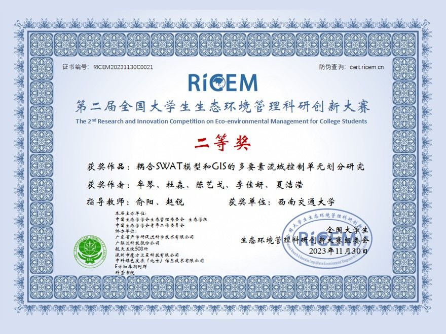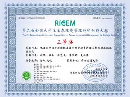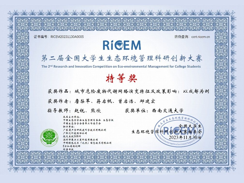 在公司环境科学与工程系赵锐、俞阳、熊欣三位老师的指导下,共有3项参赛作品获奖。其中,赵锐、熊欣老师所指导的参赛作品《城市危险废物代谢网络演变特征及政策影响:以成都为例》荣获大赛特等奖,团队成员为詹梨苹、蒋启帆、曾启浩、邱建宏;由俞阳、赵锐老师所指导的参赛作品《耦合SWAT模型和GlS的多要素流域控制单元划分研究》以及《岷江与沱江流域碳排放效率时空演变特征分析及碳减排路》分别荣获大赛二等奖、三等奖,团队成员为牟琴、杜森、陈艺戈、李佳妍、夏洁滢。
