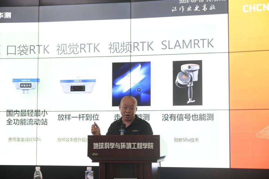 谈及智能RTK测量系统、华微3号等产品时,胡炜通过播放其分析视频,并结合在生活中的实际运用案例,展示了新装备的独特优势。这些产品不同于传统的测绘工具,融入在其中的新技术能够让测绘过程更加便捷,有效提高效率和精度。