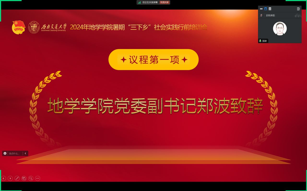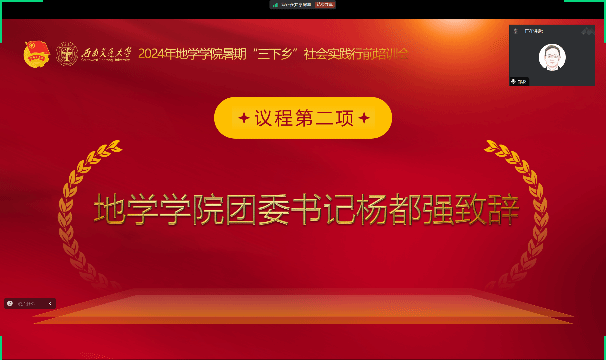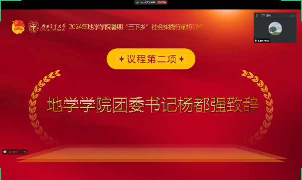 大会的第一项议程,首先由郑波书记从实践育人的层面出发,对于公司同学如何在本次活动中实践发扬“三下乡”的精神、在投身社会建设的实践活动中学习与现实结合的大思政课、坚定投身党与国家建设的理想信念提出了要求;同时强调了安全出行的重要性,希望大家能够平安出行,顺利归来。