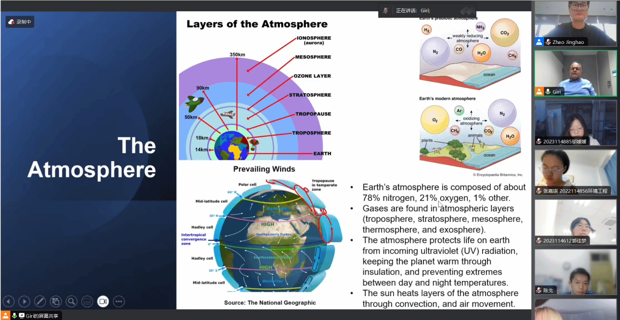 Giri老师的讲座围绕岩石圈、大气圈、水圈和生物圈的形成过程和相互作用等内容展开,介绍了板块运动和大陆漂移的概念,描述了大气层的各个层次及其功能,讨论了水圈的组成以及冰冻圈的各种形式,阐述了地球上各个圈层与生物体的相互作用以及它们的重要性,以及影响气候和环境变化的外部和内部因素。