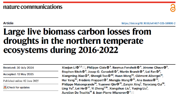 近日,BEATS李小军教授联合国内外合作者在国际综合性学术期刊Nature Communications上发表了“Large live biomass carbon losses from droughts in the northern temperate ecosystems during 2016-2022”的研究论文。该成果聚焦于干旱、火灾等森林扰动背景下,北半球活体植被碳库的变化及其影响机制,体现了遥感科学与生态学的深度交叉融合,由BEATS、法国国家农业科学研究院、北京大学等19家高校与院所联合完成。